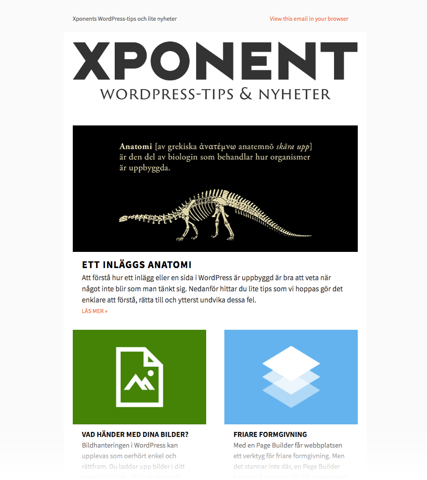 Du prenumererar säkert själv på några nyhetsbrev idag och vet att formen på dessa skiljer sig från all annan epost du tar emot. Tekniskt så är formgivna nyhetsbrev bara enklare webbsidor som skickas till dig. Xponent åtar sig att formge nyhetsbrev och även i vissa fall sätta upp lösningen åt er. Nedan visar vi exempel på hur våra utskick ser ut.