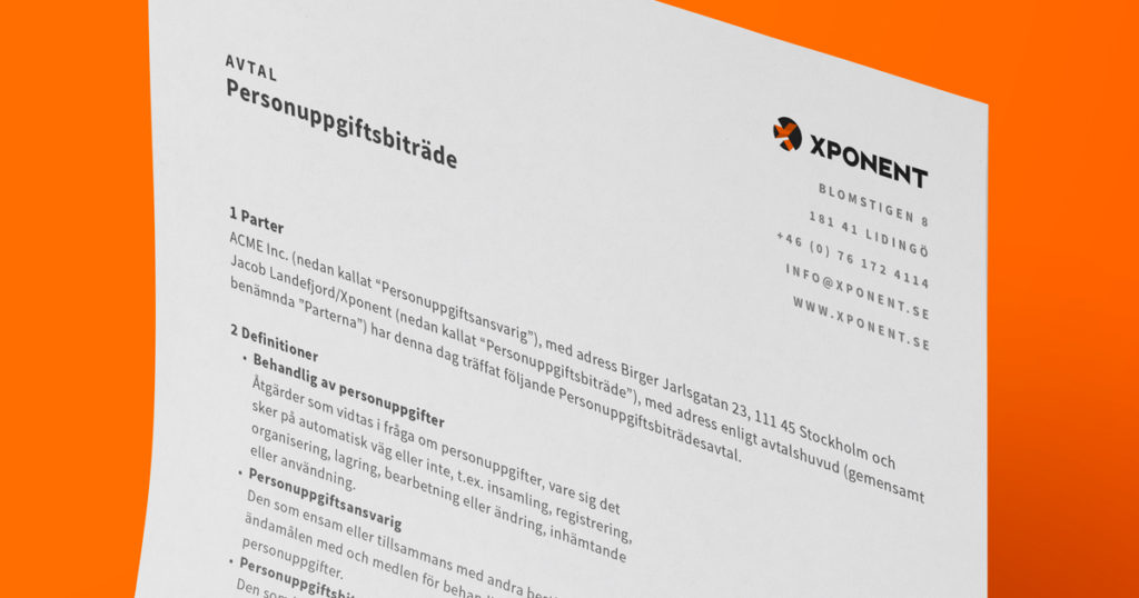 Du bör redan nu fått ett mail med en kopia av de uppgifter du skickat in till oss för att kunna sluta personuppgiftbiträdesavtal med Xponent.